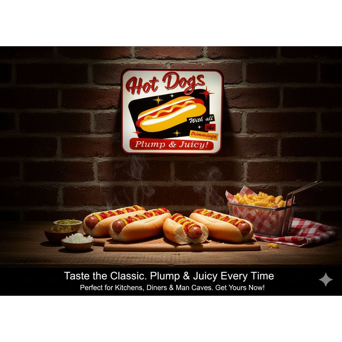 Retro Style LED Hot Dogs Sign With "Plump & Juicy!" Text